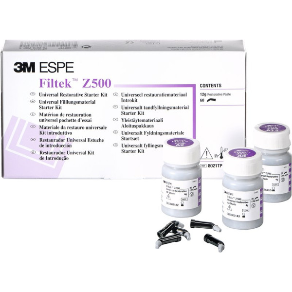 Filtek™ Z500 ist ein modernes Universal Composite unter Verwendung der klinisch erprobten Nano-Technologie von 3M. Es ist die Summe all dessen, was Sie und Ihre Patienten sich wünschen - Einfachheit, Qualität und Zuverlässigkeit. Ohne aufwändiges Schichten erzielen Sie natürlich wirkende und lang haltbare Restaurationen bei Front- oder Seitenzähnen. Filtek™ Z500 zeichnet sich durch gute Formbarkeit, geringe Klebrigkeit sowie hohe Glanzbeständigkeit bei niedrigem klinischen Verschleiß aus.Gut formbar und nicht klebendHohe Glanzbeständigkeit und geringer Verschleiß Trial Kit 3 x 20 x 0,2 g Kapsel (A2, A3, A3,5)