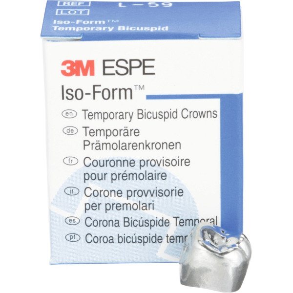 Iso-Form™ Kronen für Molaren und Prämolaren der bleibenden Dentition sind vorgefertigt und -geformt und haben einen abgerundeten Zervikalrand. Sie sind in unterschiedlichen Formen für verschiedene Einzelanwendungen erhältlich. Mit ihnen können auf einfache Weise Einzelzahnprovisorien zur Überbrückung von kurzen oder längeren Zeiträumen gefertigt werden. Packung 5 Kronen L-59
