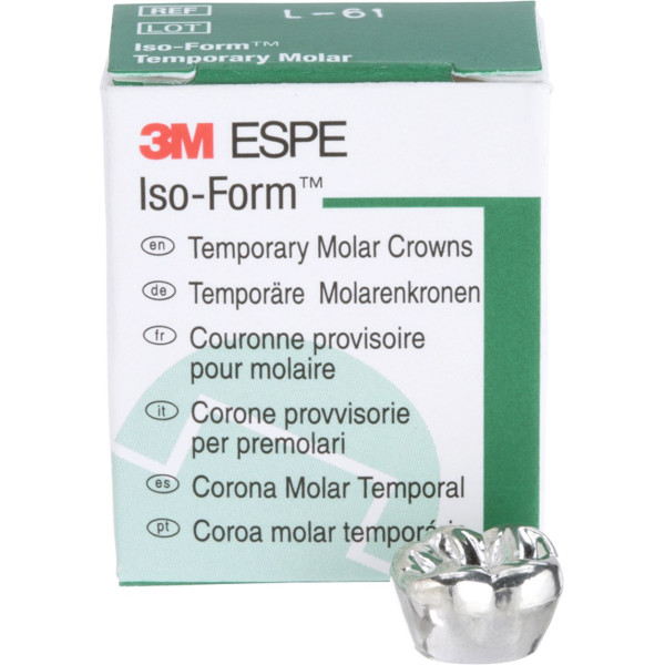 Iso-Form™ Kronen für Molaren und Prämolaren der bleibenden Dentition sind vorgefertigt und -geformt und haben einen abgerundeten Zervikalrand. Sie sind in unterschiedlichen Formen für verschiedene Einzelanwendungen erhältlich. Mit ihnen können auf einfache Weise Einzelzahnprovisorien zur Überbrückung von kurzen oder längeren Zeiträumen gefertigt werden. Packung 5 Kronen L-61