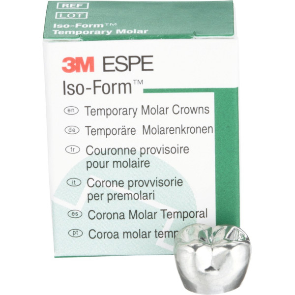Iso-Form™ Kronen für Molaren und Prämolaren der bleibenden Dentition sind vorgefertigt und -geformt und haben einen abgerundeten Zervikalrand. Sie sind in unterschiedlichen Formen für verschiedene Einzelanwendungen erhältlich. Mit ihnen können auf einfache Weise Einzelzahnprovisorien zur Überbrückung von kurzen oder längeren Zeiträumen gefertigt werden. Packung 5 Kronen L-78