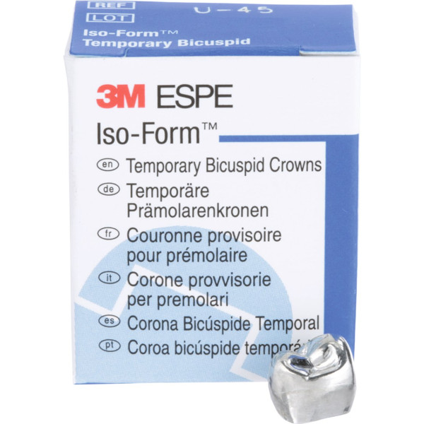 Iso-Form™ Kronen für Molaren und Prämolaren der bleibenden Dentition sind vorgefertigt und -geformt und haben einen abgerundeten Zervikalrand. Sie sind in unterschiedlichen Formen für verschiedene Einzelanwendungen erhältlich. Mit ihnen können auf einfache Weise Einzelzahnprovisorien zur Überbrückung von kurzen oder längeren Zeiträumen gefertigt werden. Packung 5 Kronen U-45