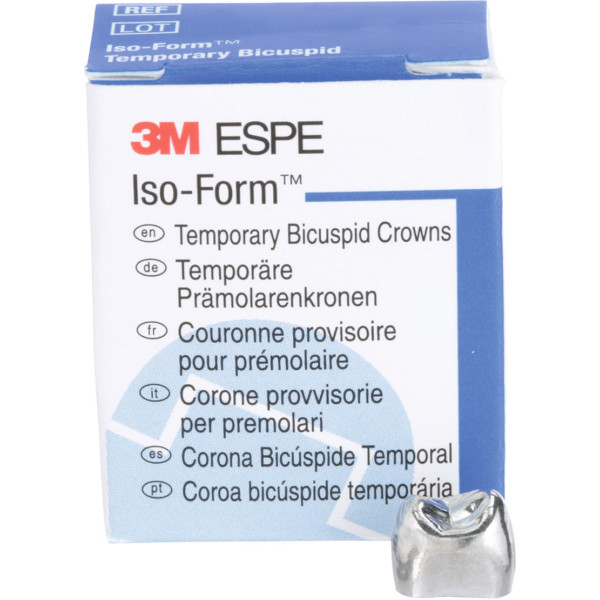 Iso-Form™ Kronen für Molaren und Prämolaren der bleibenden Dentition sind vorgefertigt und -geformt und haben einen abgerundeten Zervikalrand. Sie sind in unterschiedlichen Formen für verschiedene Einzelanwendungen erhältlich. Mit ihnen können auf einfache Weise Einzelzahnprovisorien zur Überbrückung von kurzen oder längeren Zeiträumen gefertigt werden. Packung 5 Kronen U-52