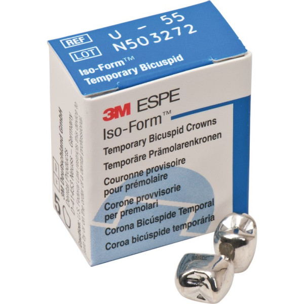 Iso-Form™ Kronen für Molaren und Prämolaren der bleibenden Dentition sind vorgefertigt und -geformt und haben einen abgerundeten Zervikalrand. Sie sind in unterschiedlichen Formen für verschiedene Einzelanwendungen erhältlich. Mit ihnen können auf einfache Weise Einzelzahnprovisorien zur Überbrückung von kurzen oder längeren Zeiträumen gefertigt werden. Packung 5 Kronen U-55