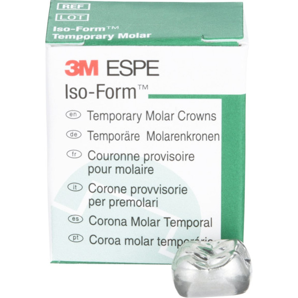 Iso-Form™ Kronen für Molaren und Prämolaren der bleibenden Dentition sind vorgefertigt und -geformt und haben einen abgerundeten Zervikalrand. Sie sind in unterschiedlichen Formen für verschiedene Einzelanwendungen erhältlich. Mit ihnen können auf einfache Weise Einzelzahnprovisorien zur Überbrückung von kurzen oder längeren Zeiträumen gefertigt werden. Packung 5 Kronen U-74