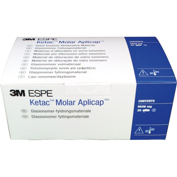Röntgensichtbarer Glasionomer-Zement in der Kapsel für Seitenzahnfüllungen (temporäre Langzeitversorgung), Milchzahnfüllungen, Stumpfaufbauten unter Kronen und als Basisfüllung unter Compositefüllungen. Im Vergleich zu konventionellen Glasionomeren hat Ketac™ Molar deutlich verbesserte mechanische Eigenschaften: Hohe Druckfestigkeit, minimale Abrasion. Ketac™ Molar hat hervorragende Verarbeitungseigenschaften: Plastisch formbar, amalgamähnlich stopfbar. Konstante Verarbeitungsqualität und praxisgerechtes Handling durch das Aplicap System. Optimale Kariesprophylaxe durch hohe Fluoridionenabgabe. Packung 20 Aplicaps A3