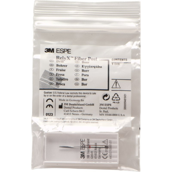 RelyX™ Fiber Post ist ein röntgenopaker, transluzenter, glasfaser-verstärkter Composite-Wurzelstift, der in vier Größen verfügbar ist. Passend zu den RelyX™ Fiber Post Wurzelstiften sind entsprechende farblich kodierte Bohrer und ein zusätzlicher Universalbohrer erhältlich. Um eine bestmögliche Haftung im Wurzelkanal zu erzielen, wird empfohlen, RelyX™ Fiber Post Wurzelstifte mit einem Composite-Zement zu zementieren. Vorteile entstehen vor allem bei der Anwendung von RelyX™ Unicem, ein selbstadhäsiver Composite-Befestigungszement. Zur Anwendung von RelyX™ Unicem im Wurzelkanal gibt es neu die passende Verlängerungskanüle oder ber RelyX™ Unicem 2 Automix die Endo-Tip Aufsätze. Stück Bohrer Größe 2