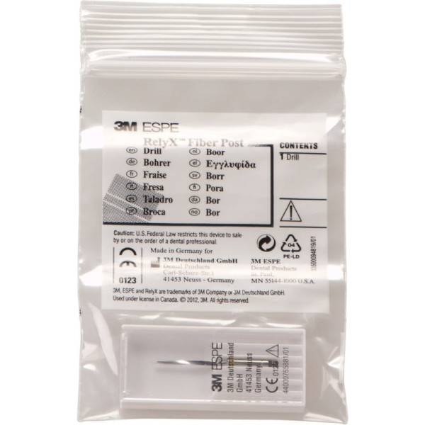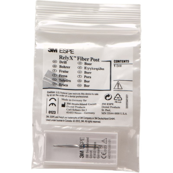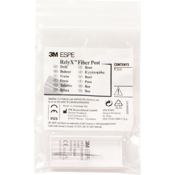 RelyX™ Fiber Post ist ein röntgenopaker, transluzenter, glasfaser-verstärkter Composite-Wurzelstift, der in vier Größen verfügbar ist. Passend zu den RelyX™ Fiber Post Wurzelstiften sind entsprechende farblich kodierte Bohrer und ein zusätzlicher Universalbohrer erhältlich. Um eine bestmögliche Haftung im Wurzelkanal zu erzielen, wird empfohlen, RelyX™ Fiber Post Wurzelstifte mit einem Composite-Zement zu zementieren. Vorteile entstehen vor allem bei der Anwendung von RelyX™ Unicem, ein selbstadhäsiver Composite-Befestigungszement. Zur Anwendung von RelyX™ Unicem im Wurzelkanal gibt es neu die passende Verlängerungskanüle oder ber RelyX™ Unicem 2 Automix die Endo-Tip Aufsätze. Stück Bohrer Größe 3