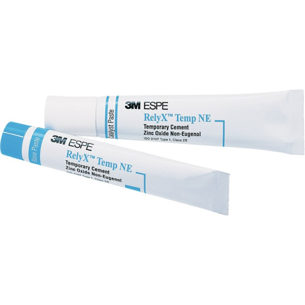 Eugenolfreier provisorischer Befestigungszement. RelyX™ Temp NE eignet sich für die temporäre Befestigung von provisorischem und definitivem Zahnersatz. RelyX™ Temp NE bietet eine gute Haftung und zugleich eine leichte Entfernbarkeit. Die Zementreste bleiben überwiegend im temporären Zahnersatz. RelyX™ Temp NE ist eugenolfrei und dadurch universell einsetzbar, unabhängig davon, ob anschließend konventionell oder adhäsiv befestigt wird. RelyX™ Temp NE ist kompatibel mit allen gängigen provisorischen K&B-, Composite-Befestigungs- und Stumpfaufbaumaterialien. RelyX™ Temp NE hat eine extrem dünne Filmstärke und ist somit der ideale Partner für einen passgenauen temporären Zahnersatz. Packung 30 g Basispaste, 13 g Katalysator, 1 Anmischblock