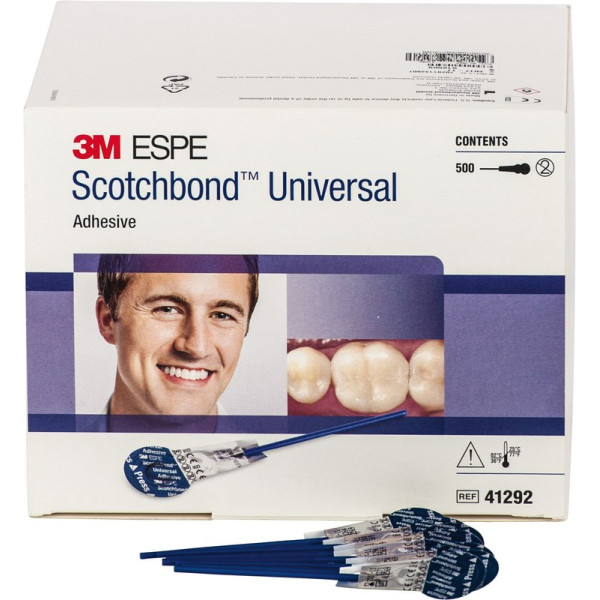 Scotchbond™ Universal Adhäsiv ist ein selbstätzendes 1-Komponenten-Adhäsiv. Es bietet sehr gute Haftwerte an Schmelz und Dentin in jeder Technik. Scotchbond™ Universal Adhäsiv überzeugt durch seine Vielseitigkeit und die damit verbundenen umfangreichen Einsatzmöglichkeiten sowie ein schnelles, einfaches Handling. Anwendbar in drei gängigen Techniken (selbstätzend, selektive Schmelzätzung, Etch&Rinse). Geeignet für alle direkten und indirekten Indikationen. Ideal als Adhäsiv für das adhäsive Befestigunscomposite RelyX Ultimate (kein Aktivator für die -Dualhärtung notwendig). Für die Verwendung anderer adhäsiven Zemente ist ein Aktivator erhältlich. Bulkpackung 200 L-Pop, 3 ml Spritze Scotchbond Universal Ätzgel, 25 Applikationskanülen, 7 Step-by-Step Karten, 1 Gebrauchsanleitung