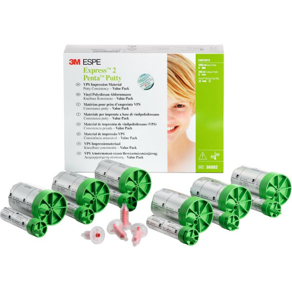 Express™ 2 ist in vielen verschiedenen Viskositäten erhältlich - von Putty bis Ultra-Light Body - für die Doppelmisch- und Korrekturtechnik. Express™ 2 bietet bestechende Präzision durch die sehr gute Balance klinisch relevanter Eigenschaften. Zum automatischen Anmischen im Pentamix Gerät. Value Packung 6 Basispasten, 6 Katalysatoren, 10 Mischkanülen rot