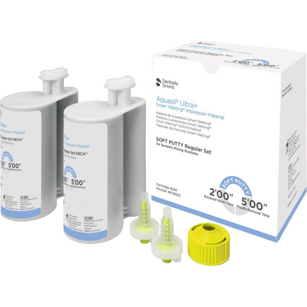 Aquasil® Ultra+ ist ein A-Silikon Abformmaterial welches für alle Abformtechniken geeignet ist. Neuste Entwicklungen sorgen dafür, dass die klinische Leistungsfähigkeit auf allen Gebieten optimiert wurde. Verbesserte Hydrophilie für höhere Präzision als je zuvor Verbesserte Reißfähigkeit für mehr Sicherheit Verschiedene Optionen bei Abbindezeiten und Applikation für bessere klinische Resultate Packung 2 x 380 ml Doppelkartusche Soft Putty DECA Regular Set, 10 Mischkanüle, 1 Verriegelungsring für Maschinenmischung