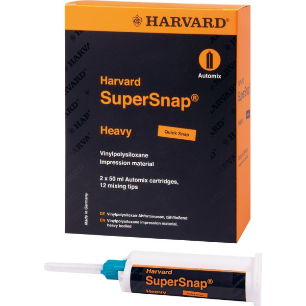 Harvard SuperSnap® az új vinyl polisziloxán lenyomatanyag. Harvard SuperSnap® hagyományos feldolgozási időt együtt egy intraorális kötési ideje mindössze 75 másodperc alatt (a „Gyors” változat). Az előnyök a gyakorló magasabbak formázó pontosságot és időt takarít meg. Mivel a sok kontrasztos színek Harvard SuperSnap® kínál a tetején, hogy a tökéletes olvashatóságot. A nagyon rövid ideig a szájban növeli, különösen érzékeny betegek kezelésére kényelmet. Rövid intraorális kötési idő a Quick S0nap változat 75 másodperc Rendkívül beteg- és felhasználóbarát nyugodt munkahelyi Kiváló folyási tulajdonságai részleteket pontosan visszaadja színe intenzív tökéletes olvashatóságot Stark ejtik hidrofilitása a legjobb eredményeket, és igen nagy pontossággal alkalmas szendvics és gitt mosás technikával RegularSnap és QuickSnap variáns elérhetőCsomag 2 x 50 ml ikerkartus Quick Heavy fekete-szürke, 12 Mischkanülen