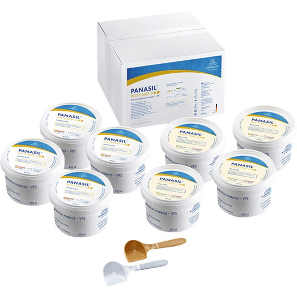 Gyúrható, addíciós keresztkötésű precíziós előlenyomat-anyag vinilpolisziloxán alapon korrekciós és szendvics-technikához. Kiszerelés: Economypackung 4 x 450 ml Basispaste, 4 x 450 ml Katalysatorpaste, putty gyors.
