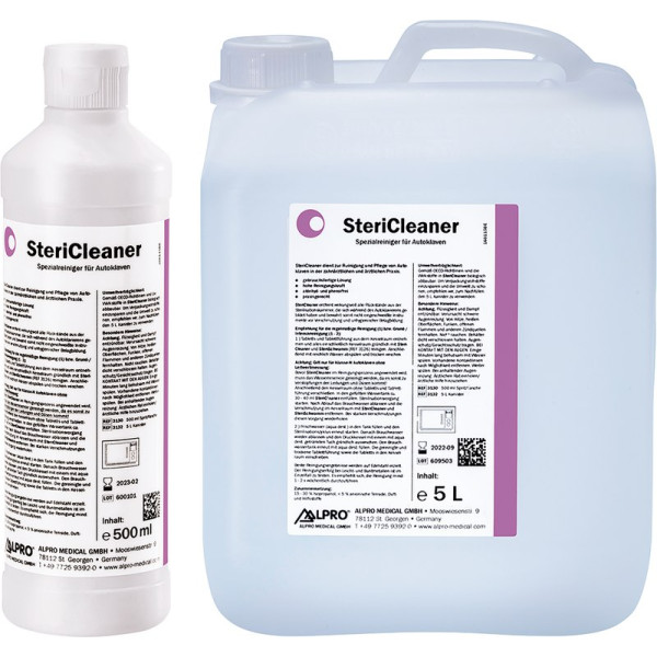 SteriCleaner ist eine gebrauchsfertige Lösung zur Reinigung der Sterilisationskammer, Instrumententabletts und Stahloberflächen. SteriCleaner entfernt selbst festsitzende Rückstände ohne große Probleme aus der Sterilisationskammer und von den Instrumententrays, äußerst Materialschonend. Flasche 500 ml
