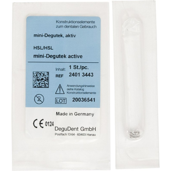 Das mini-Degutek Geschiebe ist ein intrakoronales Präzisions-T-Geschiebe, das auf der Grundlage der klassischen T-Geschiebekonstruktion entwickelt wurde. Bei den Degutek-Geschieben sind eine Reihe von Vorteilen vereint, die die Funktionen Ästhetik und Hygiene einer Geschiebeprothese deutlich verbessern. Aufgrund der Lage der Aktiviervorrichtung im mittleren unbelasteten Bereich zwischen dem gingival und okklusal geführten und abgestützten Patrizenkörper kann die Federlamelle definiert aktiviert werden. Der Grad der Friktion bleibt nach dem Zusammenfügen der Geschiebeteile erhalten, da die gingivale und okklusale flächenhafte Abstützung der Patrize Rotationsbewegungen in der Matrize abbremst und somit das Zusammenbiegen der Federlamelle verhindert. Die mini-Degutek -Geschiebe haben aufgrund der Verbreiterung der Stege der Patrizen und schmaleren kompakten Abmessungen der Proximalplatten der Matrizen eine optimale Festigkeit. Stück Geschiebe HSL/HSL