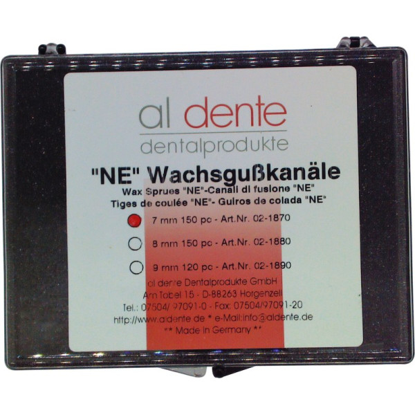 Strömungsgünstigste Form des Gusskanals. Homogeneres Gussgefüge ohne Lunker. Guss-Sticks "NEM" mit Kopfdurchmesse 7-9 mm und vergrößertem Kanalquerschnitt für Vakuumdruckguss sowie edelmetallreduzierte und NEM-Legierungen. Guss-Sticks "EM" mit Kopfdurchmesser 6-8 mm für Edelmetalllegierungen. Packung 150 Sticks NEM, 7 mm