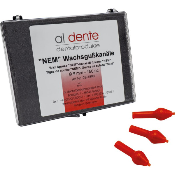 Strömungsgünstigste Form des Gusskanals. Homogeneres Gussgefüge ohne Lunker. Guss-Sticks "NEM" mit Kopfdurchmesse 7-9 mm und vergrößertem Kanalquerschnitt für Vakuumdruckguss sowie edelmetallreduzierte und NEM-Legierungen. Guss-Sticks "EM" mit Kopfdurchmesser 6-8 mm für Edelmetalllegierungen. Packung 120 Sticks NEM, 9 mm