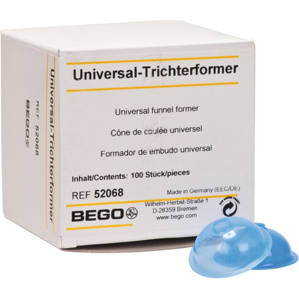 1. Universal-Trichterformer für Modellguss-Technik. Abgestimmt auf alle BEGO-Gießsysteme. 2. Trichterformer mit Reservoir für den Kombi-Schmelztiegel. 3. Trichterformer, normale Ausführung. Er wird eingesetzt, wenn die Platzverhältnisse gegen die anderen Tricherformer sprechen. 4. Trichterformer für Nautilus und andere Gießsysteme. Packung 100 Trichterformer universal