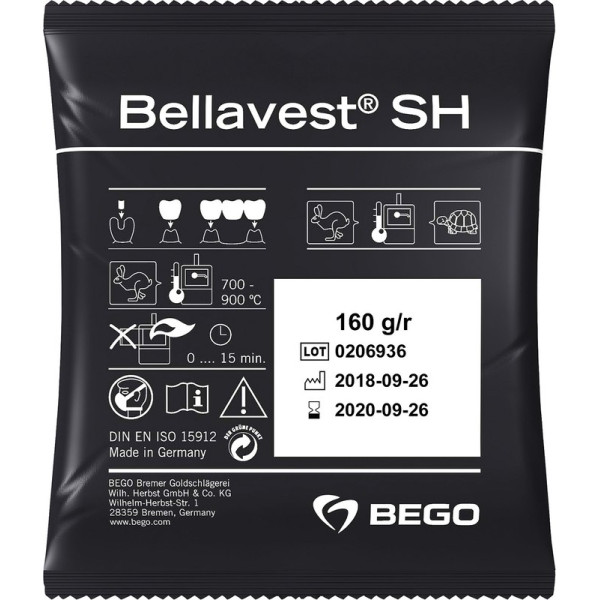Die Präzisions-Kronen- und Brücken-Einbettmasse Bellavest® SH zeichnet sich insbesondere durch ihre Universalität und Flexibilität aus. Terminanforderungen sind bequem zu koordinieren, da Bellavest® SH schnell, Einlegetemperatur bis 900 °C, oder konventionell vorgewärmt werden kann.Phosphatgebundene Präzisionsguss-Einbettmasse bietet vertrautes unmissverständliches Handling bei optimalen VerarbeitungsparameternPräzise Expansionssteuerung, feine cremige Konsistenz heißt Sicherheit in der Verarbeitung und reproduzierbare Qualität für einen Indikationsbereich von der Presskeramik bis zu Teleskop-Arbeiten aus EMF-LegierungenLange Verarbeitungszeit von 5 Minuten ermöglicht ein sicheres und entspanntes ArbeitenExtrem glatte Gussoberflächen führen zu guter Passung und Zeiteinsparung durch minimale AusarbeitungszeitenHärtet kantenfest aus und lässt sich trotzdem leicht ausbetten. Dies bedeutet für den Anwender Zeitersparnis und ökonomische Nutzung von StrahlmittelnLeicht zu verarbeiten mit dem Spezial-Anmisch-Liquid BegoSol® HE bedeutet höchste Flexibilität in der Anwendung mit nur einem Liquid Karton 50 x 100 g Beutel ohne Flüssigkeit