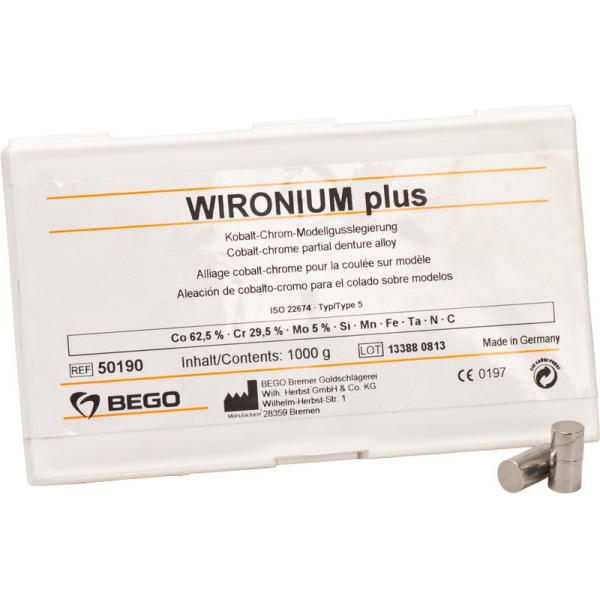 Kobalt-Chrom-Modellgusslegierung. Modellguss par excellenceUniversal-Legierung für Kombi-Arbeiten und KlammerprothesenKonsequente Weiterentwicklung der Spitzenlegierung WIRONIUMGesteigerte Dehngrenze, Zugfestigkeit und hohe Bruchdehnung für Präzisionssicherung bei Kombi- und KlammerprothesenÜberragende physikalische Eigenschaften für Sicherheit gegenüber elastischer und plastischer VerformungBiokompatibilität durch neutrales Institut untersucht Packung 1 kg Legeirung