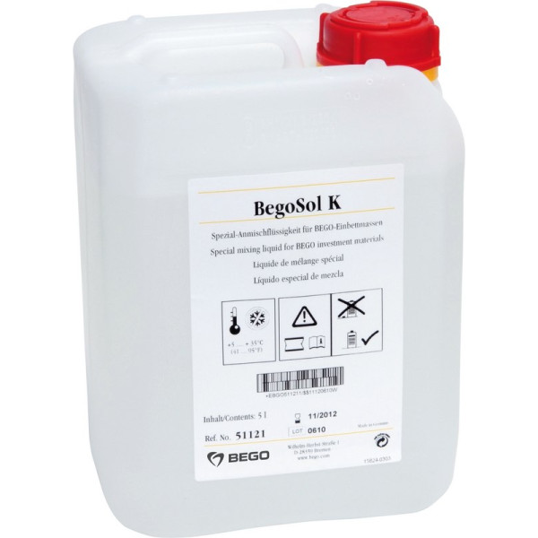 Spezial Anmischliquid (frostempfindlich) für Wirofine und Bellastar XL und VarseoVest P plus. Je nach Legierung und Einsatzgebiet kann es mit destilliertem oder entmineralisiertem Wasser auf das erforderliche Mischverhältnis gebracht werden. Je höher die Konzentration von BegoSol® K, desto höher die Expansion der Einbettmasse. Kanister 5 Liter BegoSol K für den Sommer
