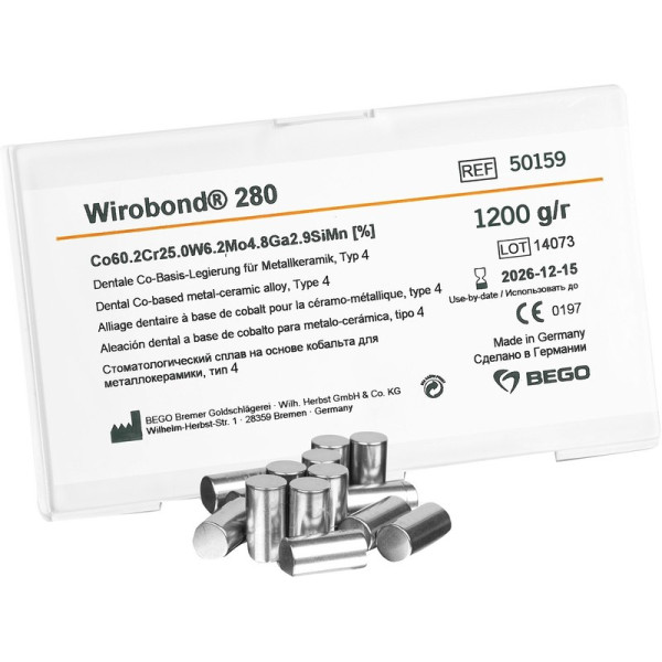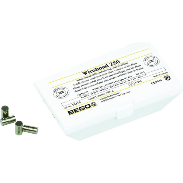 Die edelmetallfreie Premium-Legierung für Aufbrennkeramik oder Kunststoffverblendung - nickel- und berylliumfrei. Wirobond® 280 setzt Maßstäbe im Segment der edelmetallfreien Aufbrennlegierungen, denn mit einer Vickershärte von 280 HV10 lässt sie sich besonders gut ausarbeiten Extrem korrosionsbeständig durch optimales Zusammenwirken der unverzichtbaren Elemente Chrom und Molybdän Sehr gute Schmelz- und Gießeigenschaften Keine Langzeitabkühlung erforderlich*, auch nicht bei großen Spannen Sicherer Haftverbund mit Keramik Große Festigkeit bei allen Spannweiten, dadurch breiter Indikationsbereich Sichere Verarbeitung nach dem bewährten BEGO System Biokompatibel und korrosionsbeständig Chemische Zusammensetzung: Co 60,2 · Cr 25,0 · W 6,2 · Mo 4,8 · Ga 2,9 · Mn · Si Packung 1 kg Legierung