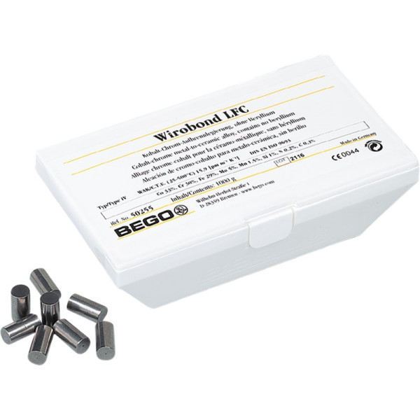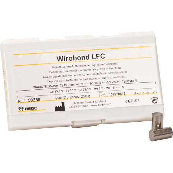 Kobalt-Chrom-Aufbrenn-Legierung für hochexpandierende Keramiken (LFC-Massen) Der WAK-Wert von 15,6 [10-6 x K-1] ermöglicht eine normale Abkühlung – für wirtschaftliches und effektives Arbeiten Hoher Verbund mit der LFC-Keramik – auch bei mehrfachen Keramikbränden Kontrollierter Gehalt an Kohlenstoff – zum Löten und Laserschweißen sehr gut geeignet Biokompatibel und korrosionsbeständig Chemische Zusammensetzung: Co 33,9 · Fe 30,0 · Cr 28,5 · Mo 5,0 · Mn 1,0 · Si 1,0 · C · N Packung 250 g Legierung