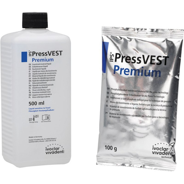 IPS® PressVEST Premium ist die universelle, phosphatgebundene Einbettmasse für Ivoclar Vivadent-Presskeramiken. Sie kann sowohl im beliebten Speed- als auch im konventionellen Aufheizverfahren verwendet werden. Besonders die minimale, leicht zu entfernende Reaktionsschicht, die glatten Oberflächen und die sehr hohe Passgenauigkeit zeichnen sie aus. Packung 2,5 kg Pulver