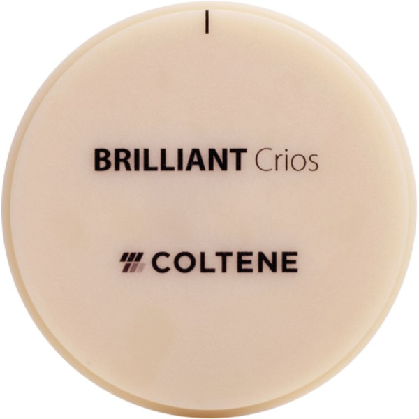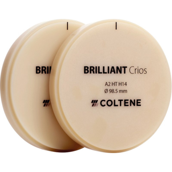 High performance – made brilliant BRILLIANT Crios ist ein Hochleistungs-Komposit Block. Das Material kombiniert alle Vorteile eines innovativen Submicron-Hybrid-Composite-Werkstoffs mit denen eines CAD/CAM Herstellungsverfahrens für die zuverlässige, ästhetische und schnelle Produktion von Restaurationen ohne separaten Brennvorgang. BRILLIANT Crios Discs erweitern das bestehende CAD/CAM Portfolio von COLTENE. Die Discs haben exakt die gleiche Zusammensetzung wie die Blöcke und damit den gleichen hohen Qualitätsstandard, lediglich in anderer Form. Die Discs sind insbesondere für häufige CAD/CAM Anwender wie Labors oder Fräszentren von Interesse, da diese viel wirtschaftlicher sind und mehrere Restaurationen in einem Schleif-/ Frässchritt geschliffen werden können. Stück Disc H 18 mm, A2 HT