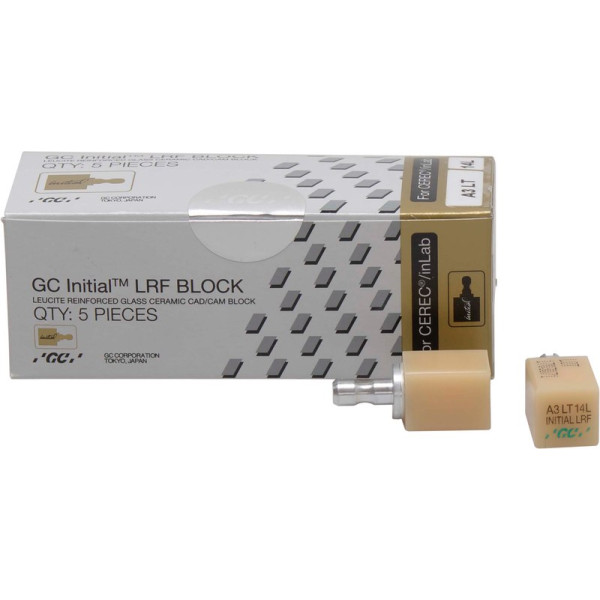 Der GC Initial™ LRF BLOCK ist ein leuzitverstärkter Feldspat-CAD/CAM-Block, in je fünf Hoch- und Niedrig-Transparenten V-Farben. Er eignet sich für indirekte vollkeramische, vollanatomische Restaurationen. Ganz gleich ob Sie einfach nur polieren oder mit der speziellen Glasurpaste glasieren, GC Initial™ LRF bietet Ihnen die höchste Bruchstabilität & Biegefestigkeit in seiner Klasse. Packung 5 Blöcke Größe 14L, A3 LT