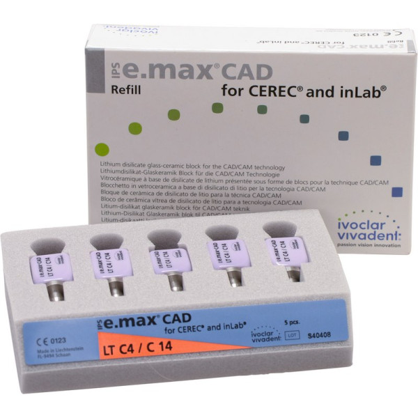 Die IPS e.max CAD for CEREC/inLab ist eine hochfeste Lithiumdisilikat-Vollkeramik, mit idealen ästhetischen Eigenschaften. Die Keramikblocks sind optimal für die Herstellung von vollanatomischen Kronen, Inlays und Veneers geeignet und werden im inLab-System oder CEREC-System (Sirona) verarbeitet. Die Blocks sind in unkristallisiertem Zustand bläulich und leicht bearbeitbar. Nach dem Kristallisationsbrand ist die Keramik zahnfarben und hochfest. IPS e.max Kronen aus CAD LT können selbstadhäsiv oder konventionell befestigt werden.Inlays und Veneers aus IPS e.max CAD HT können minimalinvasiv präpariert werden, werden jedoch adhäsiv befestigt.Im Basic Kit stehen alle für einen Einsteiger notwendigen Materialien für die Herstellung einer IPS e.max Krone aus CAD LT zur Verfügung stehen. Zum Brennen wird der Brennofen Programat CS2 oder CS3 (oder gleichwertige Geräte) empfohlen. Packung 5 Blöcke Größe C14, C4 LT