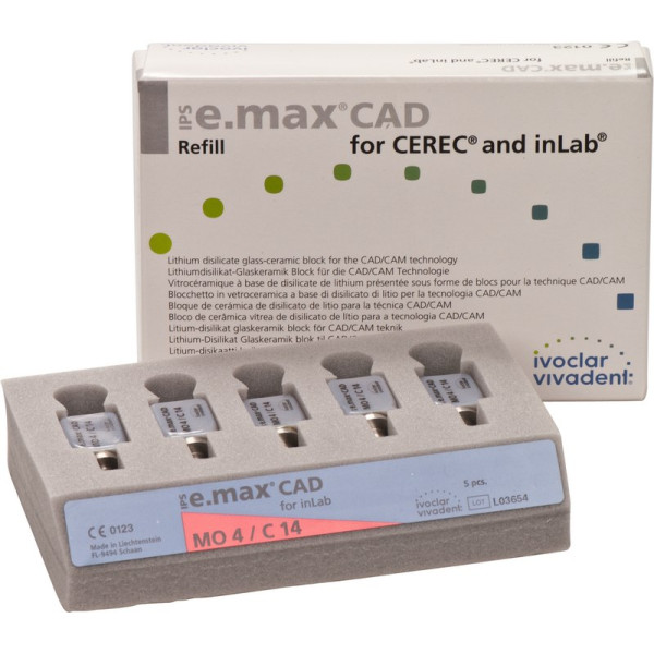 Die IPS e.max CAD for CEREC/inLab ist eine hochfeste Lithiumdisilikat-Vollkeramik, mit idealen ästhetischen Eigenschaften. Die Keramikblocks sind optimal für die Herstellung von vollanatomischen Kronen, Inlays und Veneers geeignet und werden im inLab-System oder CEREC-System (Sirona) verarbeitet. Die Blocks sind in unkristallisiertem Zustand bläulich und leicht bearbeitbar. Nach dem Kristallisationsbrand ist die Keramik zahnfarben und hochfest. IPS e.max Kronen aus CAD LT können selbstadhäsiv oder konventionell befestigt werden.Inlays und Veneers aus IPS e.max CAD HT können minimalinvasiv präpariert werden, werden jedoch adhäsiv befestigt.Im Basic Kit stehen alle für einen Einsteiger notwendigen Materialien für die Herstellung einer IPS e.max Krone aus CAD LT zur Verfügung stehen. Zum Brennen wird der Brennofen Programat CS2 oder CS3 (oder gleichwertige Geräte) empfohlen. Packung 5 Blöcke Größe C14, MO4