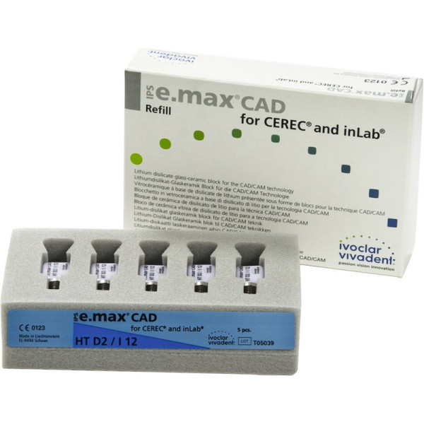 Die IPS e.max CAD for CEREC/inLab ist eine hochfeste Lithiumdisilikat-Vollkeramik, mit idealen ästhetischen Eigenschaften. Die Keramikblocks sind optimal für die Herstellung von vollanatomischen Kronen, Inlays und Veneers geeignet und werden im inLab-System oder CEREC-System (Sirona) verarbeitet. Die Blocks sind in unkristallisiertem Zustand bläulich und leicht bearbeitbar. Nach dem Kristallisationsbrand ist die Keramik zahnfarben und hochfest. IPS e.max Kronen aus CAD LT können selbstadhäsiv oder konventionell befestigt werden.Inlays und Veneers aus IPS e.max CAD HT können minimalinvasiv präpariert werden, werden jedoch adhäsiv befestigt.Im Basic Kit stehen alle für einen Einsteiger notwendigen Materialien für die Herstellung einer IPS e.max Krone aus CAD LT zur Verfügung stehen. Zum Brennen wird der Brennofen Programat CS2 oder CS3 (oder gleichwertige Geräte) empfohlen. Packung 5 Blöcke Größe I12, D2 HT