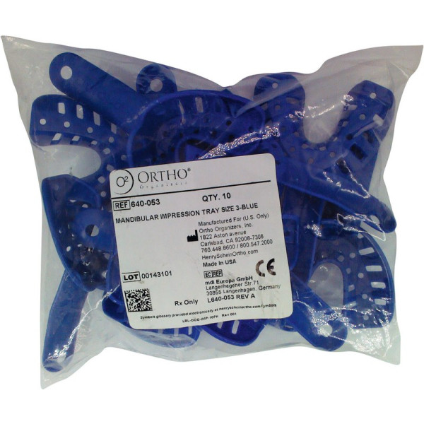 Die 6 Größen für Ober- und Unterkiefer gewährleisten einen optimalen Abdruck für Kinder und Erwachsene. Die perforierten Seitenwände sorgen für die richtige Position und die Stabilität der Abformmassen. Jede Größe ist mit einem Farbcode und einer Nummer versehen. Die Abdrucklöffel sind wiederverwendbar oder auch als Einmalartikel verwendbar. Kaltsterilisation empfohlen. Packung 10 Abformlöffel UK, Größe 3, blau