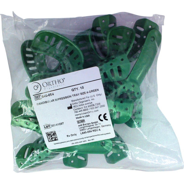 Die 6 Größen für Ober- und Unterkiefer gewährleisten einen optimalen Abdruck für Kinder und Erwachsene. Die perforierten Seitenwände sorgen für die richtige Position und die Stabilität der Abformmassen. Jede Größe ist mit einem Farbcode und einer Nummer versehen. Die Abdrucklöffel sind wiederverwendbar oder auch als Einmalartikel verwendbar. Kaltsterilisation empfohlen. Packung 10 Abformlöffel UK, Größe 4, grün