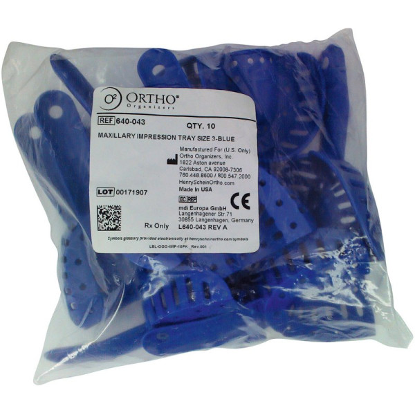 Die 6 Größen für Ober- und Unterkiefer gewährleisten einen optimalen Abdruck für Kinder und Erwachsene. Die perforierten Seitenwände sorgen für die richtige Position und die Stabilität der Abformmassen. Jede Größe ist mit einem Farbcode und einer Nummer versehen. Die Abdrucklöffel sind wiederverwendbar oder auch als Einmalartikel verwendbar. Kaltsterilisation empfohlen. Packung 10 Abformlöffel OK, Größe 2, orange