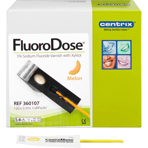 FluoroDose® enthält einen 5%igen weißen Natriumfluorid-Kavitätenlack in der LolliPack -Einwegpackung, die maximal zulässige Fluoriddosis, und ist von der FDA für die Behandlung von Dentinüberempfindlichkeit zugelassen. Keine schmierenden Gele und unbequemen Löffel mehr; keine Angst mehr vor dem Verschlucken von Fluorid. Eintauchen. Mischen. Auftragen. Wegwerfen. Centrix macht die Fluoridlackierung sicherer und das Reinigen einfacher. Packung 120 x 0,3 ml LolliPack Melon