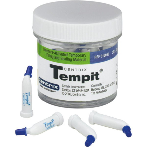 Feuchtigkeitsaktiviertes provisorisches Füllungs- und Verschlussmaterial. Speziell für den Verschluss der Zugangskavitäten zwischen einzelnen Sitzungen einer Wurzelkanalbehandlung entwickelt. In eine feuchte Kavität einspritzen, andrücken, dann den Patienten entlassen. Tempit® bindet in maximal 5 Minuten ab.VorteileKein Anmischen, kein Verschmutzen. Einzeldosis-Spritzenaufsätze für einfaches Einbringen, höchste Asepsis. Bindet in Minutenschnelle ab, beim nächsten Termin einfach zu entfernen. Enthält Kalziumsulfat und Zinkoxid. Eugenolfreie Rezeptur. Packung 30 x 0,35 g Cap