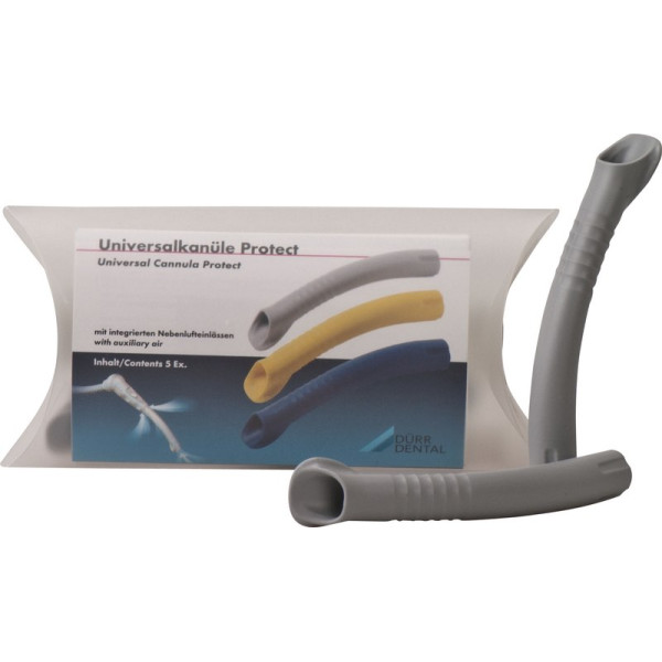 Universalkanüle Protect - mit integrierten Nebenlufteinlässen am Schaft. Die Nebenluftkanäle verhindern zuverlässig einen Reflux aus dem Saugsystem und bieten die sicherste Prävention vor Kreuzinfektionen. Der Volumenstrom nimmt dabei kaum ab - die Kanüle bietet die gewohnte Saugleistung. Packung 5 Universalkanülen grau