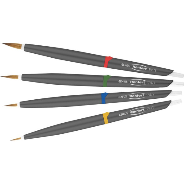 Hochwertiger Naturhaarpinsel mit integrierter Schutzfunktion im Griff in modernem Design. Um beim Pinselhaar hohe Werte in puncto Spannung, Formstabilität und Langlebigkeit zu erreichen, kommt hier die einzigartige Fertigungstechnik von Renfert zum Einsatz. Vorteile Hohe Langlebigkeit der Pinselhaare durch eine innovative Schutzfunktion Schlanke Haarform aufgrund der hochwertigen Haarqualität Besonders wirtschaftlich durch einfach zu wechselnde Pinseleinsätze Details Sicheres Aktivieren der Schutzfunktion durch einen leichtgängigen Drehmechanismus Kontrollierter Trocknungsprozess aufgrund der durchlüfteten Schutzfunktion Einheitliche Haptik für alle Griffpositionen Integrierter Wegrollschutz Set 4 Keramikpinsel sortiert
