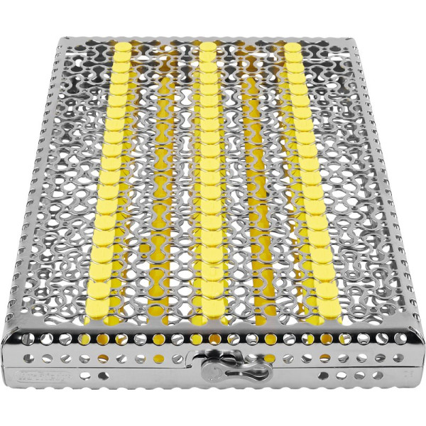 Die neuen IMS Kassetten im einzigartigen, revolutionärem neuen Lochmuster-Design besitzen ca. 30% mehr Öffnungen. Die innovativen Silikonschienen, die deutlich weniger Kontaktpunkte mit den Instrumenten haben, bieten beste Bedingungen bei Reinigung, Spülen und Wasserabfluss und erzeugen somit weniger Spülschatten. Ein ergonomischer, anwenderfreundlicher Verschluss zeigt, ob die Kassette offen oder geschlossen ist. Der neue Verschluss kann mit einer Hand geöffnet werden. Optimal für den Einsatz im RDG. Stück Kassette DIN für 6 Instrumente gelb