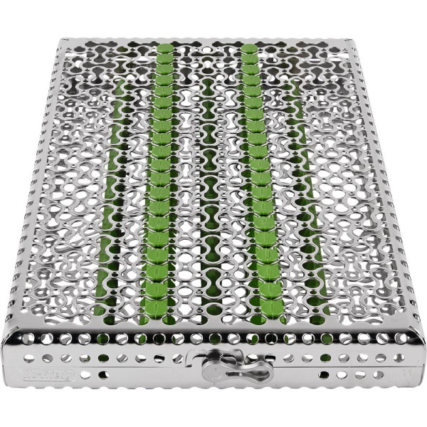 Die neuen IMS Kassetten im einzigartigen, revolutionärem neuen Lochmuster-Design besitzen ca. 30% mehr Öffnungen. Die innovativen Silikonschienen, die deutlich weniger Kontaktpunkte mit den Instrumenten haben, bieten beste Bedingungen bei Reinigung, Spülen und Wasserabfluss und erzeugen somit weniger Spülschatten. Ein ergonomischer, anwenderfreundlicher Verschluss zeigt, ob die Kassette offen oder geschlossen ist. Der neue Verschluss kann mit einer Hand geöffnet werden. Optimal für den Einsatz im RDG. Stück Kassette DIN für 6 Instrumente grün