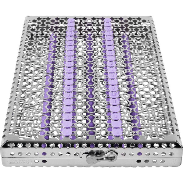 Die neuen IMS Kassetten im einzigartigen, revolutionärem neuen Lochmuster-Design besitzen ca. 30% mehr Öffnungen. Die innovativen Silikonschienen, die deutlich weniger Kontaktpunkte mit den Instrumenten haben, bieten beste Bedingungen bei Reinigung, Spülen und Wasserabfluss und erzeugen somit weniger Spülschatten. Ein ergonomischer, anwenderfreundlicher Verschluss zeigt, ob die Kassette offen oder geschlossen ist. Der neue Verschluss kann mit einer Hand geöffnet werden. Optimal für den Einsatz im RDG. Stück Kassette DIN für 6 Instrumente lila