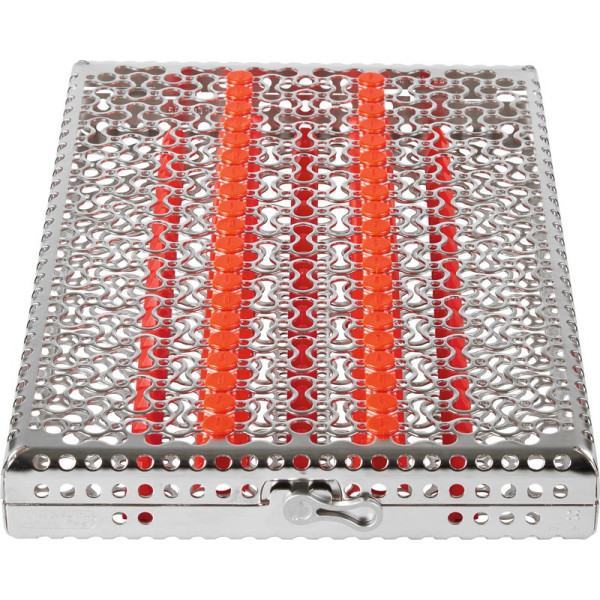 Die neuen IMS Kassetten im einzigartigen, revolutionärem neuen Lochmuster-Design besitzen ca. 30% mehr Öffnungen. Die innovativen Silikonschienen, die deutlich weniger Kontaktpunkte mit den Instrumenten haben, bieten beste Bedingungen bei Reinigung, Spülen und Wasserabfluss und erzeugen somit weniger Spülschatten. Ein ergonomischer, anwenderfreundlicher Verschluss zeigt, ob die Kassette offen oder geschlossen ist. Der neue Verschluss kann mit einer Hand geöffnet werden. Optimal für den Einsatz im RDG. Stück Kassette DIN für 6 Instrumente rot