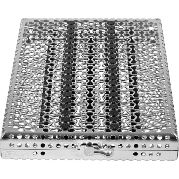 Die neuen IMS Kassetten im einzigartigen, revolutionärem neuen Lochmuster-Design besitzen ca. 30% mehr Öffnungen. Die innovativen Silikonschienen, die deutlich weniger Kontaktpunkte mit den Instrumenten haben, bieten beste Bedingungen bei Reinigung, Spülen und Wasserabfluss und erzeugen somit weniger Spülschatten. Ein ergonomischer, anwenderfreundlicher Verschluss zeigt, ob die Kassette offen oder geschlossen ist. Der neue Verschluss kann mit einer Hand geöffnet werden. Optimal für den Einsatz im RDG. Stück Kassette DIN für 6 Instrumente schwarz