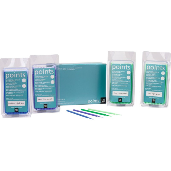 Mit Points Einweg-Pinselapplikatoren können kleine Mengen Flüssigkeit schnell und punktgenau auch an schwer zugängliche Stellen gebracht werden. Points sind gegenüber Lösungsmitteln unempfindlich. Die verwendeten Fasern sind Lösungsmitteln gegenüber unempfindlich. Die Fasern lösen sich während der Applikation nicht. Die Flüssigkeit wird nicht aufgesaugt sondern verbleibt auf den Fasern bis zur Applikation. Sortiment 4 x 100 Pinsel (lila/superfein, dunkelgrün/fein, hellgrün/fein, dunkelblau/ medium)