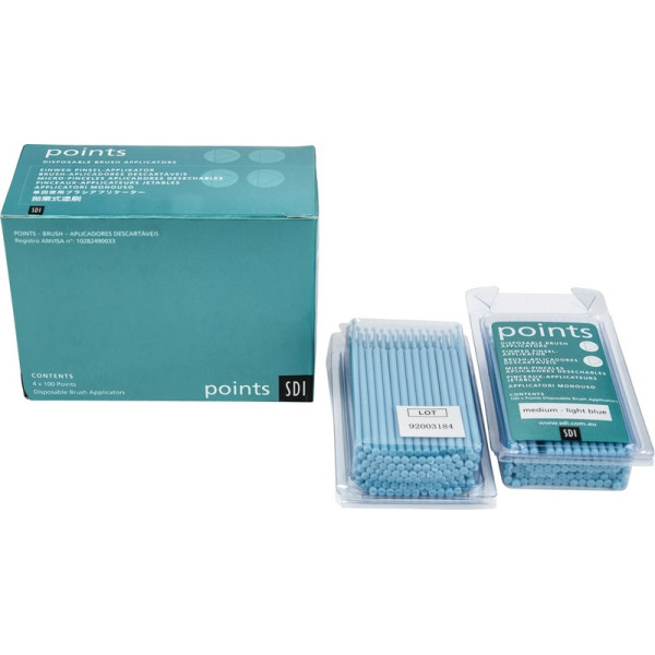 Mit Points Einweg-Pinselapplikatoren können kleine Mengen Flüssigkeit schnell und punktgenau auch an schwer zugängliche Stellen gebracht werden. Points sind gegenüber Lösungsmitteln unempfindlich. Die verwendeten Fasern sind Lösungsmitteln gegenüber unempfindlich. Die Fasern lösen sich während der Applikation nicht. Die Flüssigkeit wird nicht aufgesaugt sondern verbleibt auf den Fasern bis zur Applikation. Packung 400 Pinsel hellblau