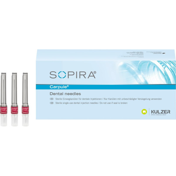 SOPIRA® Carpule® Kanülen - Refill Packung 100 Stück 27G, 38 mm, langer Anschliff, dunkelrot, Typ Injektion Nervenblockade - 6605