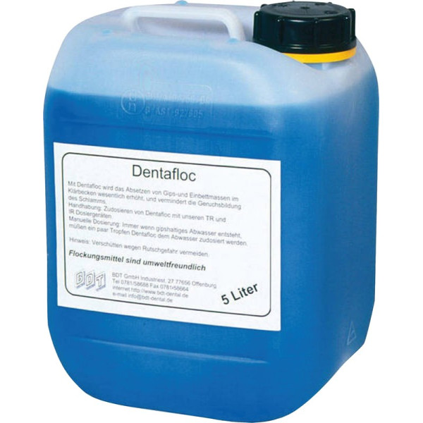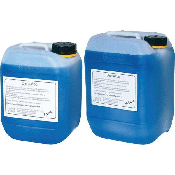 Durch Einsatz von Dentafloc wird in den Gipsabscheidern das Absenken des Gipsschlammes wesentlich beschleunigt und die Reinigung wird erleichtert. An allen Arbeitsplätzen, an denen gipshaltiges Abwasser anfällt, ist das Auffangen der gelösten Gipsteile unproblematisch und einfach durchzuführen. Kanister 5 Liter