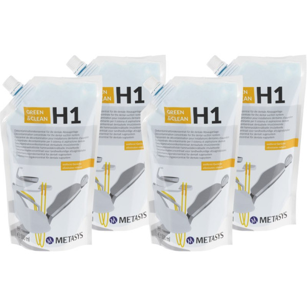 Reinigungs- und Desinfektionspräparat für das automatische Hygienesystem H1 von METASYS. Kostengünstige Pflege und Desinfektion der gesamten Absauganlage gezielt nach Entnahme des Saugschlauches. GREEN&CLEAN H1 wird über nachfüllbare Cartridges (Inhalt reicht im Durchschnitt für eine Arbeitswoche) dem Absaugsystem zugeführt oder direkt über den Beutel angeschlossen. Hervorragende Reinigungswirkung. Enzyme sorgen zudem für eine gute Eiweißlöslichkeit, wodurch auch alte Ablagerungen beseitigt werden. Mit Aktiv-Entschäumern. Biologisch abbaubar. CE 0408. Nachfüllpackung 4 x 500 ml Beutel